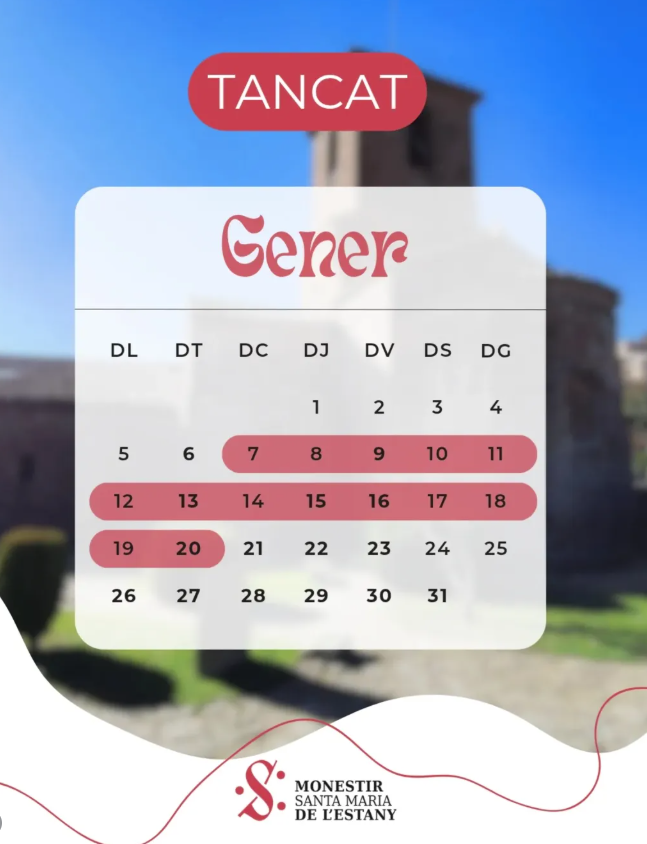 El Claustre del Monestir de l'Estany informa que estarà tancat per vacances del 7 al 20 de gener, ambdós inclosos